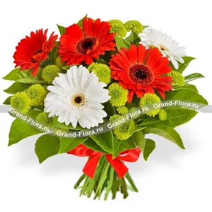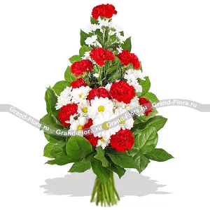 Пестрые мечты - букет из красных гвоздик и хризантемы