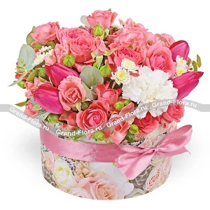 Просто улыбнись! - коробка с розовыми розами и тюльпанами