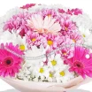 Уменьшенный: гербера малиновая - 2 шт., гербера розовая - 1 шт., хризантема белая кустовая - 2 шт., хризантема розовая кустовая - 2 шт., гипсофила - 2 шт., фетр розовый, бант фиолетовый.