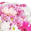 ДЕЛЮКС: гербера малиновая - 5 шт., гербера розовая - 4 шт., хризантема белая кустовая - 4 шт., хризантема розовая кустовая - 4 шт., гипсофила - 5 шт., фетр розовый, бант фиолетовый.