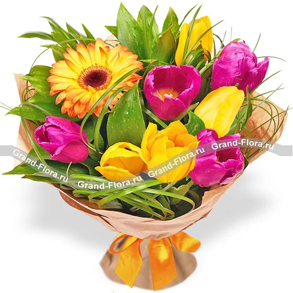 герберы желтые (оранжевые) - 1 шт., тюльпаны фиолетовые - 4 шт., тюльпаны желтые - 4 шт., рускус., берграс., упаковка крафт., лента желтая.