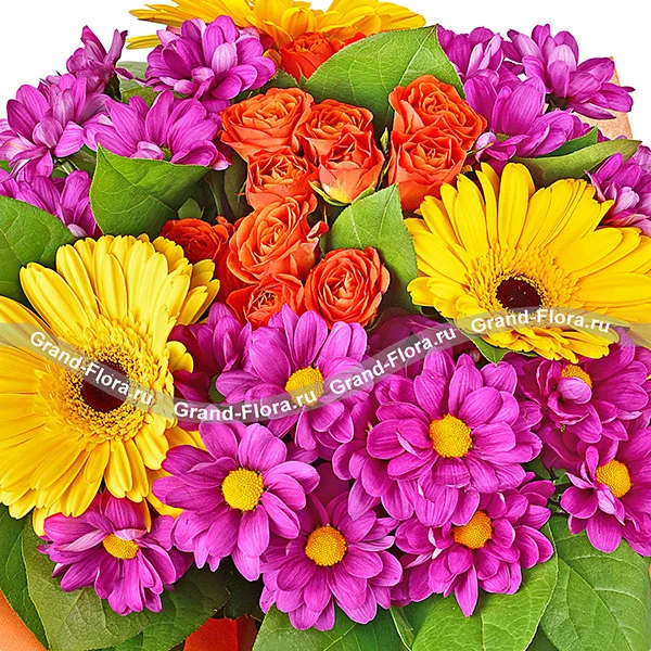 Аккуратный и стильный букет непременно вызовет восхищение своего счастливого обладателя. Сочетание оранжевых кустовых роз и фиолетовой хризантемы на фоне крупных цветков желтой герберы подчёркнуто насыщенно-зелёными листьями салала. Совершенство можно подарить, когда оно воплощено в цветах.