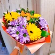 Стандартный (на фото): хризантема кустовая ромашковая (фиолетовая) - 3 шт, гербера желтая - 3 шт, роза кустовая оранжевая/розовая - 1 шт (в центре), рускус или салал, фетр оранжевый. Примерный размер: 25Х25 см.