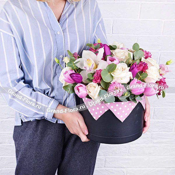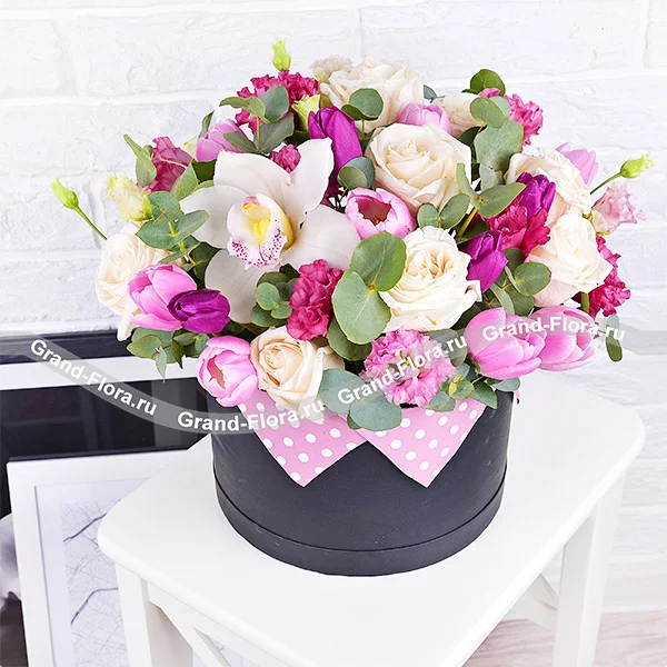 Букет выполнен из чудесных белых роз сорта Ломоносов, очаровательных фиолетовых и розовых тюльпанов, а так же изящной розовой эустомы и невообразимо прекрасной орхидеи кристально – белого оттенка. Композиция украшена эвкалиптом и заключена в шляпную коробку. Высота композиции от 30 см, диаметр от 25см до 35 см, в зависимости от выбранного Вами варианта. Обращаем Ваш внимание, что состав и оформление могут отличаться.
