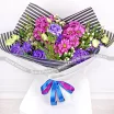 Фиолетовая хризантема и фиолетовая эустома в этом букете символизируют красоту и элегантность, а также добавляют элементы духовности и мудрости. Полосатая упаковка добавляет еще больше элегантности и изысканности к букету. Этот букет может быть прекрасным выбором для тех, кто хочет выразить свою мудрость или духовность или просто подарить красоту и гармонию кому-то близкому.